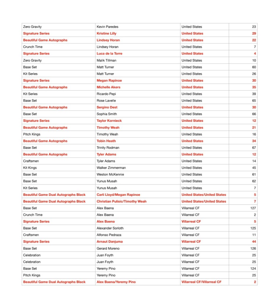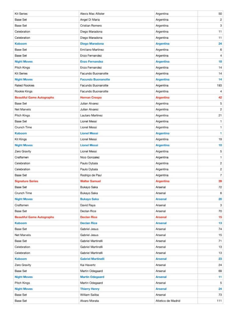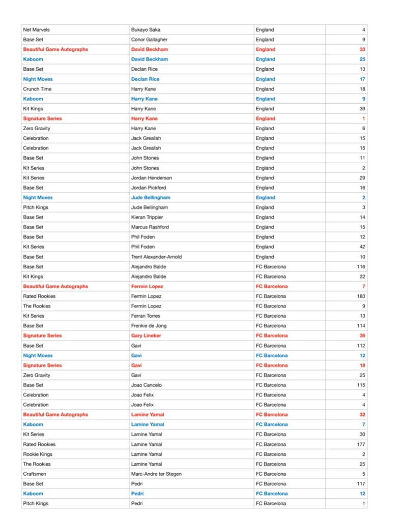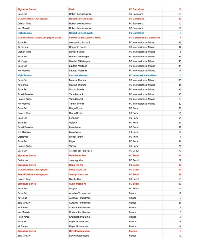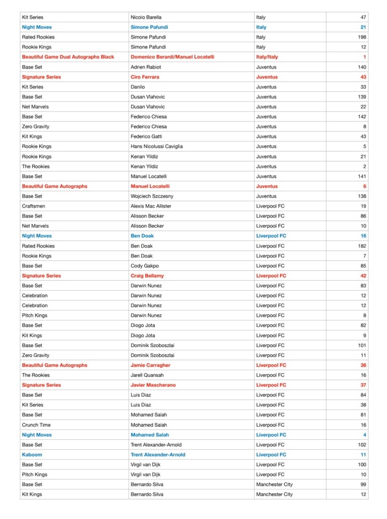 Golden Goal Breaks a réuni la checklist des Panini Donruss Socxer 23/24 ! En rouge vous trouverez les cartes autos et en bleu les case hit.