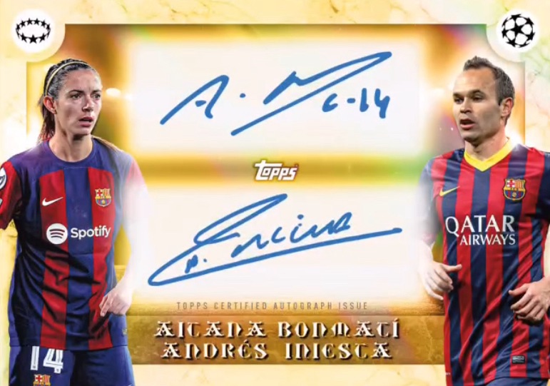 Bonmatí a souvent été comparée à Andres Iniesta, et Topps a donc eu la bonne idée de créer leur carte double auto qui sera sans doute la chase de cette box!