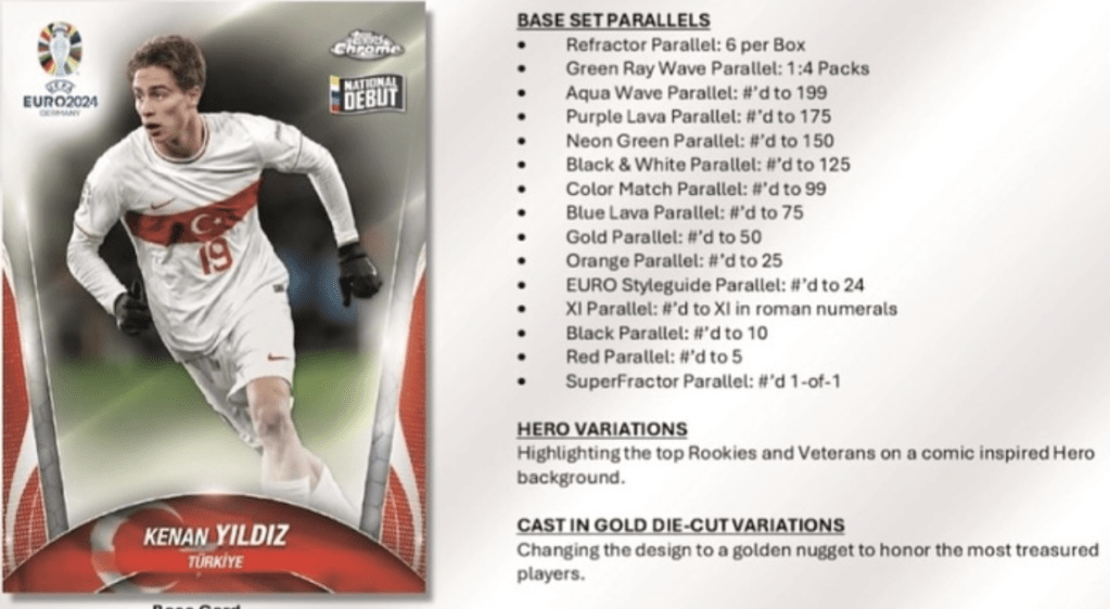 Malgrè les rumeurs, et les espoirs, Topps n’a toujours pas le droit d’utiliser les licences des équipes de France, Allemagne, Italie et Angleterre, 4 des nations phares de l’EURO. L’Espagne, vainqueur du tournoi, sera bien présente et il n’y pas de doute que des joueurs comme Rodri, Nico Williams et surtout Yamal seront bien mis en avant dans cette collection de 150 cartes bases représentant les 24 équipes participantes.