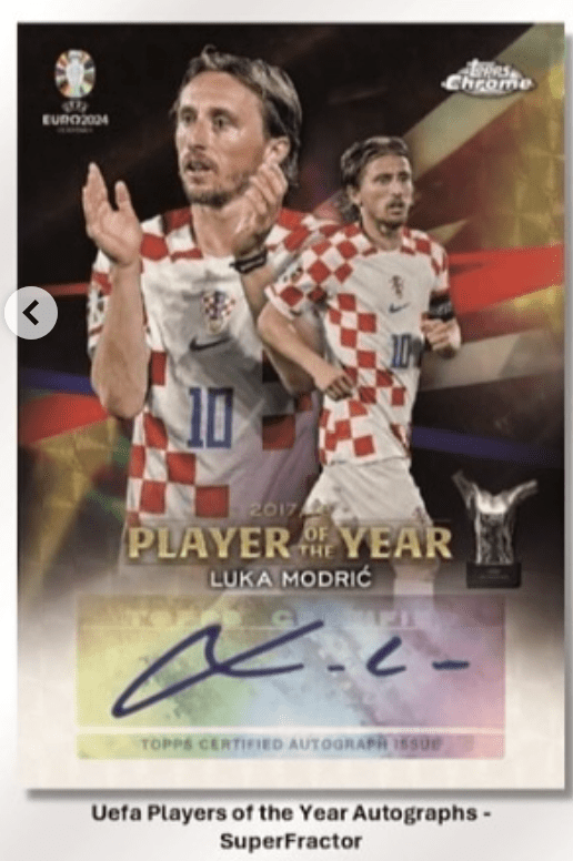 Pour les cartes auto il y aura le retour des cartes Black Lazer introduites cette année dans les Topps Chrome UCC, et surtout les Players of The Tournament : un booklet disponible en 1/1 que Topps nous a dévoilé sur son compte X. notez que chaque joueur de ce booklet aura aussi son auto Player of Tournament dispo en carte 1/1 et /5. De plus Topps a mis le paquet avec carte double et triple auto, carte memorabilia avec relic du tirage au sort et des cartes Sketch.